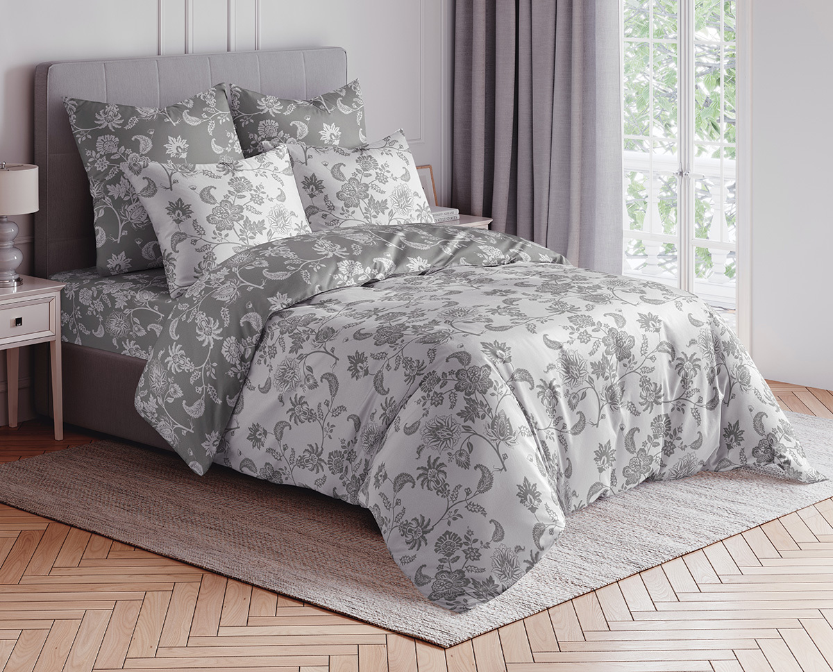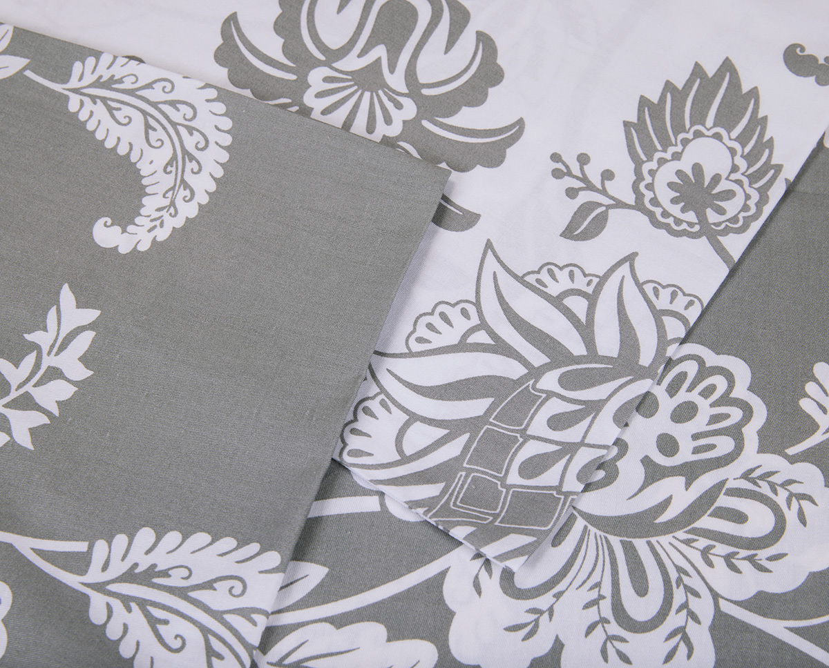 Комплекты выполнены из двух тканей-компаньонов. Из основной ткани: одна сторона пододеяльника, наволочки 70х70 см, одна сторона наволочек 50х70 см. Из ткани-компаньона: вторая сторона пододеяльника, простыня, одна сторона наволочек 50х70 см.