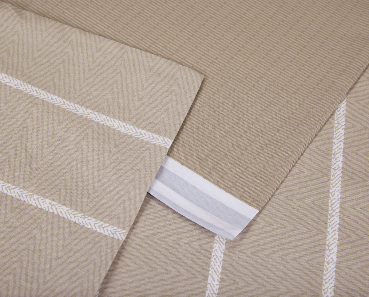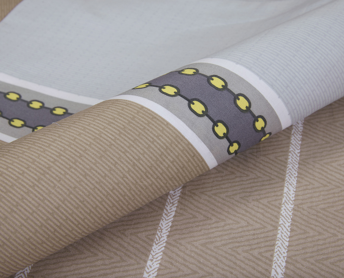 Комплекты выполнены из двух тканей-компаньонов. Из основной ткани: одна сторона пододеяльника, наволочки 70х70 см, одна сторона наволочек 50х70 см. Из ткани-компаньона: вторая сторона пододеяльника, простыня, одна сторона наволочек 50х70 см.