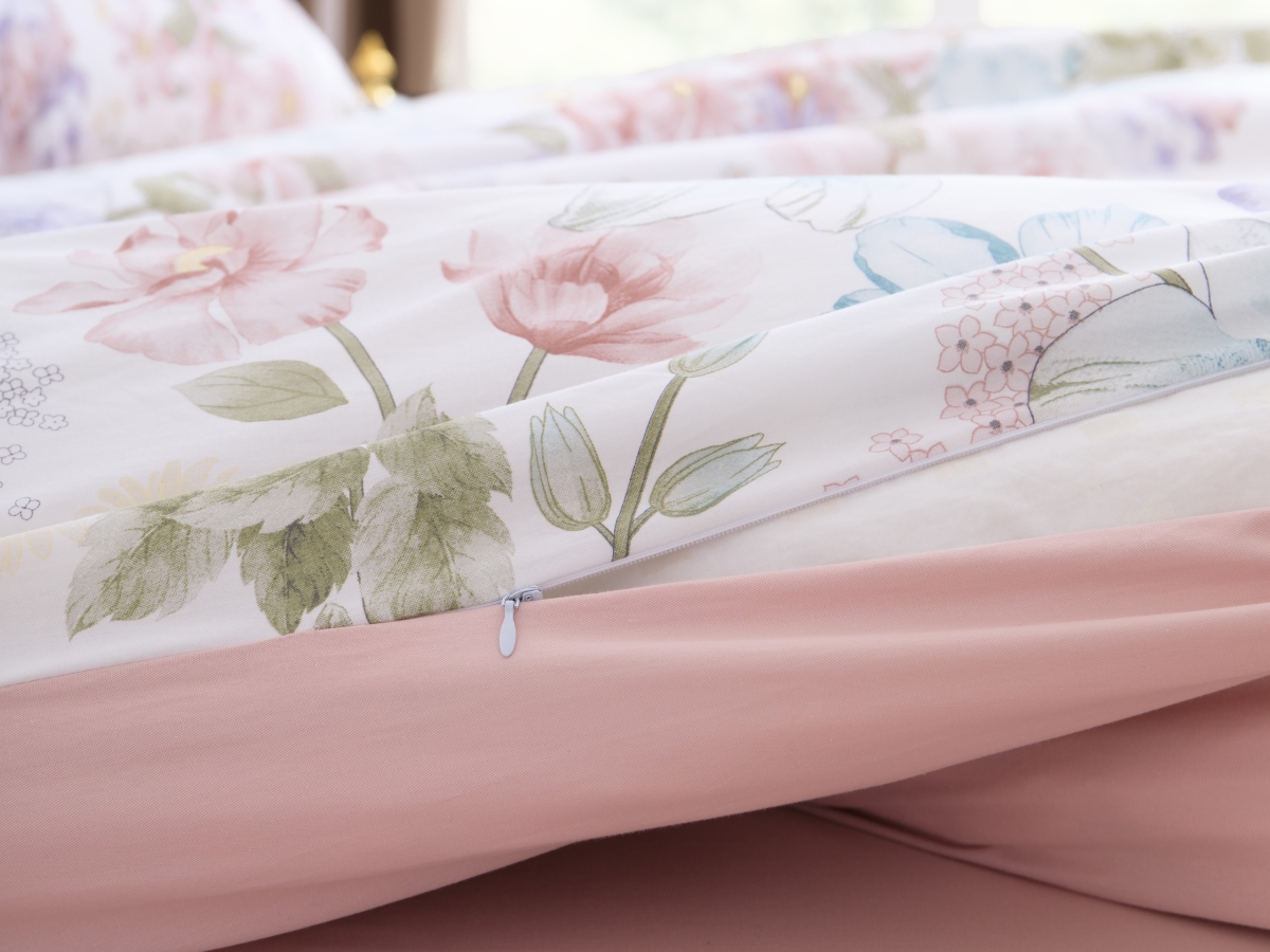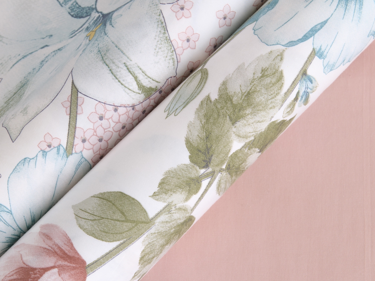 Комплекты выполнены из двух тканей-компаньонов. Из основной ткани: одна сторона пододеяльника, наволочки 70х70 см, одна сторона наволочек 50х70 см. Из ткани-компаньона: вторая сторона пододеяльника, простыня, одна сторона наволочек 50х70 см.