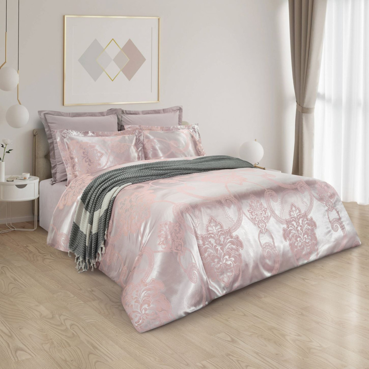 Жаккард: вискоза + хлопок. Сатин: 100% хлопок (простыня, наволочки 70*70, обратная сторона пододеяльника).