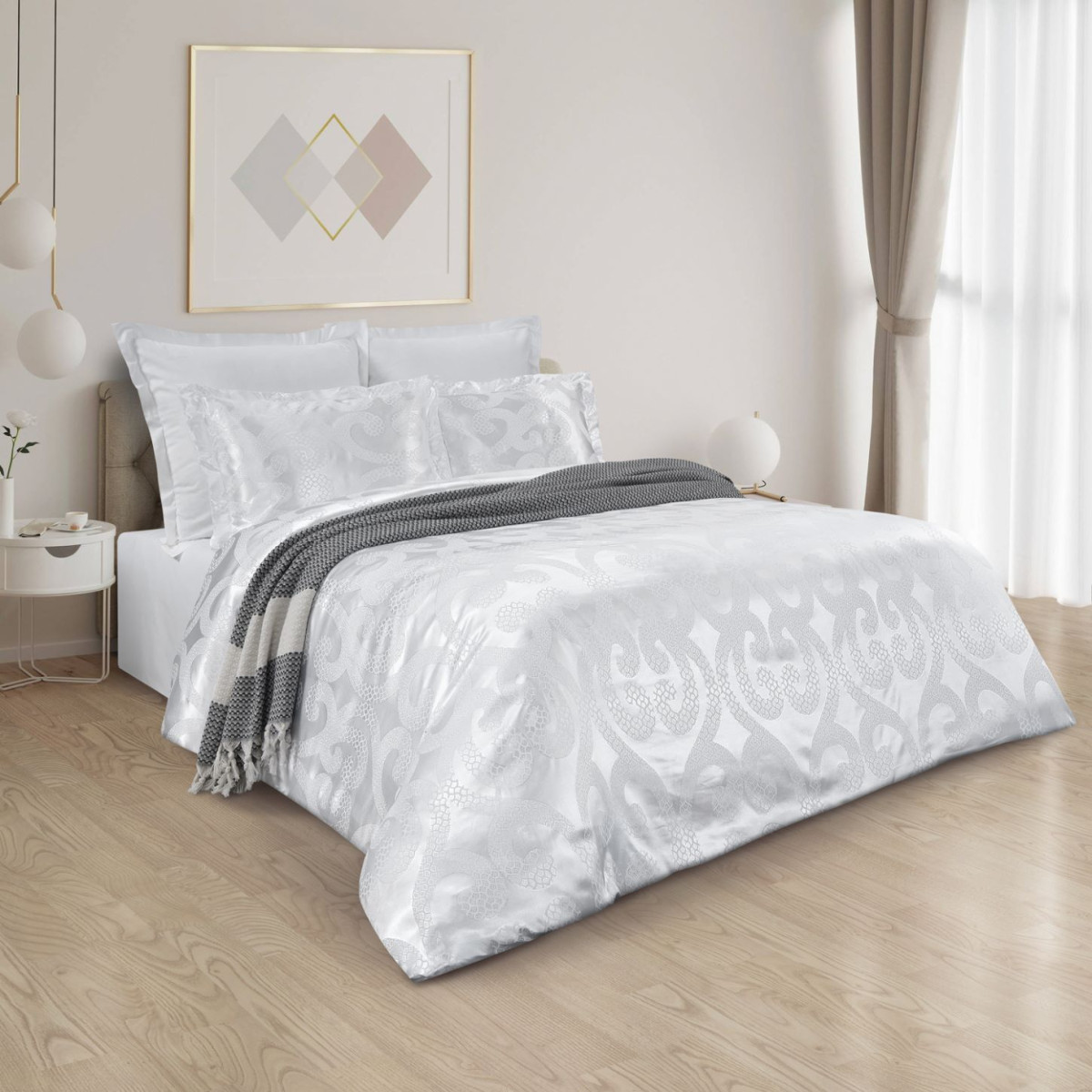 Жаккард: вискоза + хлопок. Сатин: 100% хлопок (простыня, наволочки 70*70, обратная сторона пододеяльника).