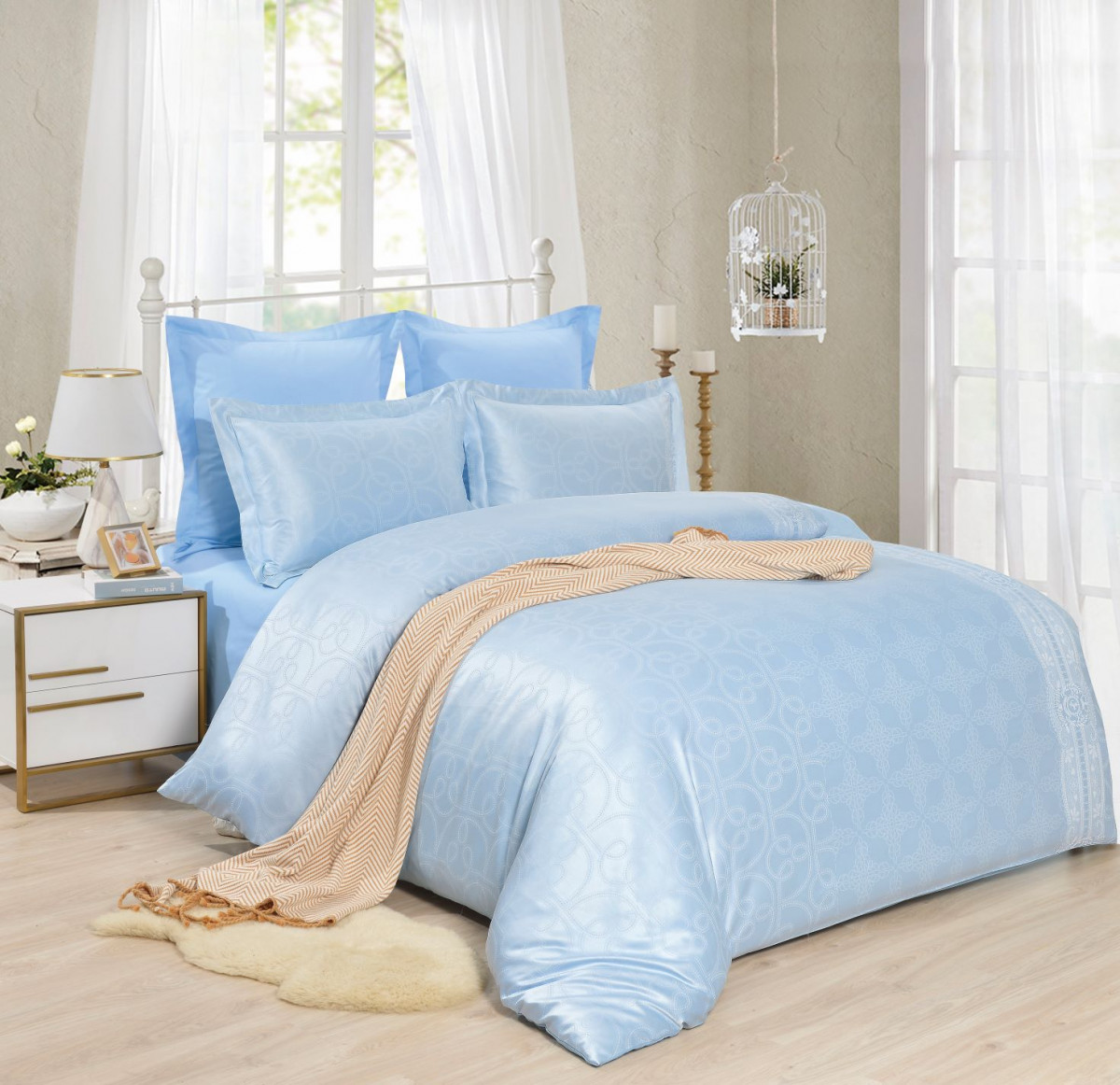 Жаккард: вискоза + хлопок. Сатин: 100% хлопок (простыня, наволочки 70*70, обратная сторона пододеяльника).